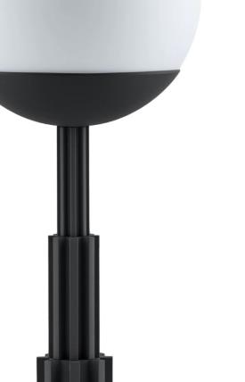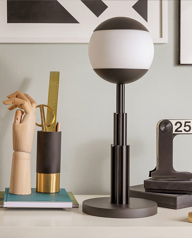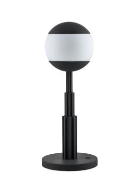 Design. Aldo Rossi Dimensions : Ø 18 x h 47 cm lampe de table en aluminium coloré, noir et sphère en verre. Batterie rechargeable et touch dimmer. Lumière LED 5W 5V. Adaptateur avec fiches interchangeables.