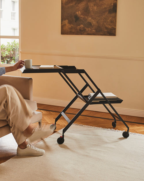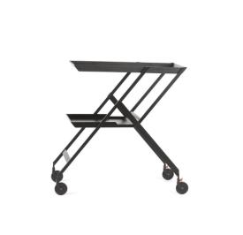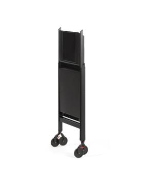 Alessi Design. Richard Sapper Dimensions : l 46 x h 78 x p 86 cm Conçu par Richard Sapper dans les années 70, le chariot Plico est l’un des projets les moins connus, bien qu’extrêmement représentatifs, de l’œuvre de cet auteur inoubliable. Maniable et extrêmement compact une fois rabattu, Plico peut être utilisé aussi bien comme chariot pour porter les repas que comme petite table de chevet ou bout de canapé. Une fois rabattu, le chariot occupe une surface minimale qui permet de le mettre derrière une porte ou entre deux meubles de la cuisine. Les freins placés sur les roues postérieures rendent le chariot autoportant une fois qu'il est rabattu. table roulante pliable en acier coloré à la résine au époxyde, noir. Plans en polyuréthane.
