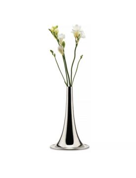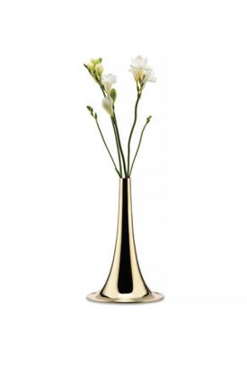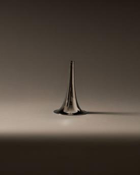 Inspiré par la figure du Lapin blanc, personnage à la trompette qui ouvre à Alice la voie vers le pays des merveilles, Michael Anastassiades a imaginé une série de vases baptisée Trumpet, dont la forme est réalisée selon le même procédé que celui employé pour produire le pavillon de cet antique instrument à vent. Pour ce projet, le créateur a choisi l’une des techniques les plus traditionnelles de façonnage manuel du métal : le fluotournage, qui consiste à façonner un disque de métal, généralement du laiton, en repoussant la matière de façon à rétrécir progressivement son diamètre jusqu’à atteindre la taille d’un doigt, dimension qui permet alors de souder la pièce au reste du corps de l’objet à réaliser. Sous le regard poétique d’Anastassiades, ce procédé, utilisé pour la production de la majorité des instruments à vent, donne ainsi vie à ces vases dont le fond convexe, qui remonte à l’intérieur du corps, n’est pas sans rappeler la forme dont ils s’inspirent. Disponible en deux versions : laiton et laiton argenté.