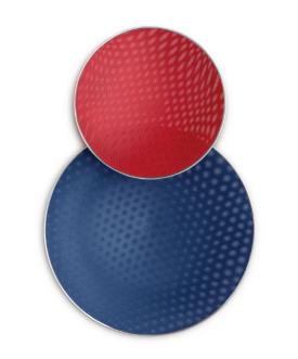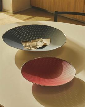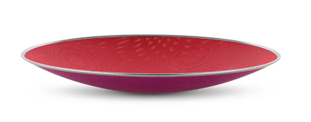 Design. Susan Cohn, CSA Dimensions : Ø 33 x h 5 cm Centre de table ajouré en acier coloré à la résine au époxyde, rouge et violet. Alessi 100 Values Collection.