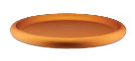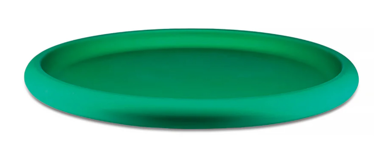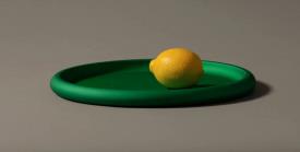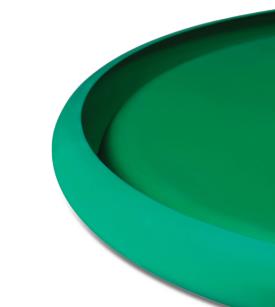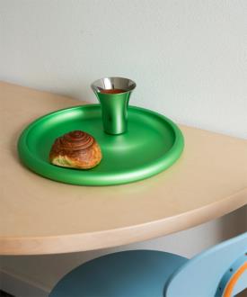 Alessi Design. Federico Angi Dimensions : Ø 34 x h 2,5 cm Fasciné par la forme des plateaux en aluminium sur lesquels sont traditionnellement servies les pintes de bière Kölsch à Cologne, Federico Angi a imaginé un objet d’apparence simple et familière. Discolo est un centre de table doté d’un bord généreux qui dissimule un design et une fabrication complexes. Son corps en aluminium anodisé se décline en trois coloris : orange, vert ou bleu, qui soulignent la forme de l’objet et lui confèrent une forte présence scénique. Centre de table avec bordure généreuse en aluminium anodisé, vert.