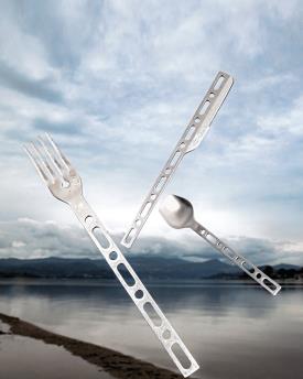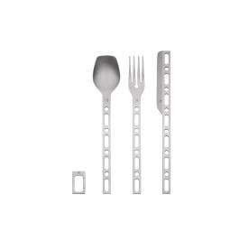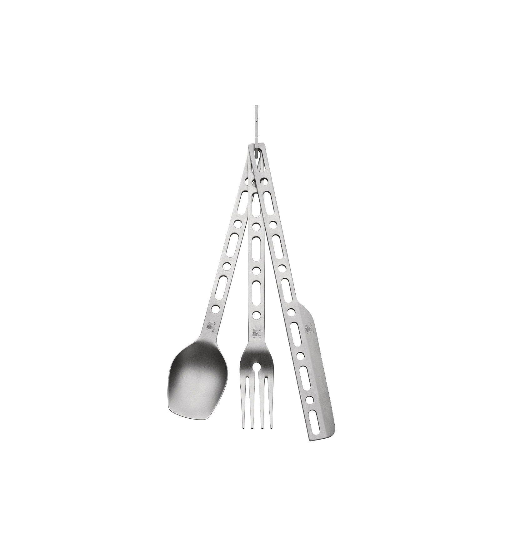Service à couverts : cuiller, fourchettes, couteau avec mousqueton en acier inoxydable 18/10. Edition limitée à 999 pièces numérotées et 3 épreuves d’auteur.