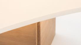 La base, à la géométrie rhomboïdale en contreplaqué de noyer clair, est complétée par une structure métallique en X qui étire le diffuseur, créant un équilibre entre tension et légèreté.