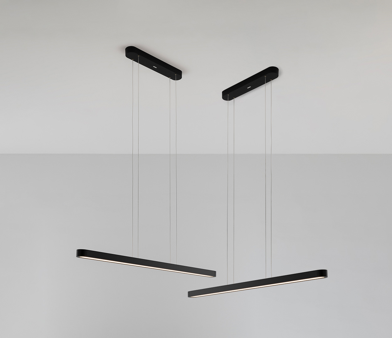 Artemide Design. Neil Poulton, Code : 1921010A / 1921020A / 1921080A, à partir de 835 € Dimensions : L 90/120/150 x h 100 cm Élémentaire et fonctionnelle, sa géométrie se prête à accueillir des circuits LED de différentes sources en s’étirant pour répartir l’émission et prendre en charge différentes nécessités d’éclairage. CARACTERISTIQUES Matériaux: Aluminium, méthacrylate, polycarbonate Emission: Indirecte Diffusante/Directe Dark Light lampe suspension