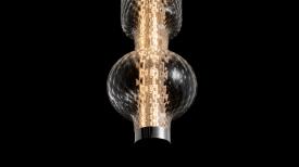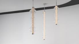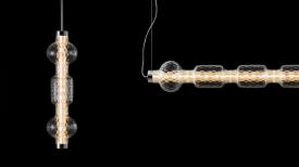 Artemide Design. Neil Poulton, Code : 2047010A / 2047010APP / 2046010A / 2046010APP Dimensions : Horizontal : l 121 x h 19 x p 19 cm - Vertical : l 19 x h 151 x p 19 cm - Ø 27 x h 152 cm Alambicco est un luminaire modulaire qui met en valeur la beauté du verre soufflé, en jouant avec les transparences et les textures pour moduler et diffuser la lumière. En son centre, une structure en aluminium extrudé supporte les circuits LED sur ses quatre faces opposées : c’est le noyau technologique autour duquel se développent les différentes couches. La première couche est composée d’un cylindre en verre moleté, conçu pour réfracter la vue des composants sans les dissimuler totalement, tout en garantissant une lumière non éblouissante. Autour de ce noyau viennent s’ajouter des diffuseurs aux formes douces et transparentes, sublimés par un travail artisanal inspiré de l’ancienne technique du balloton. lampe suspension