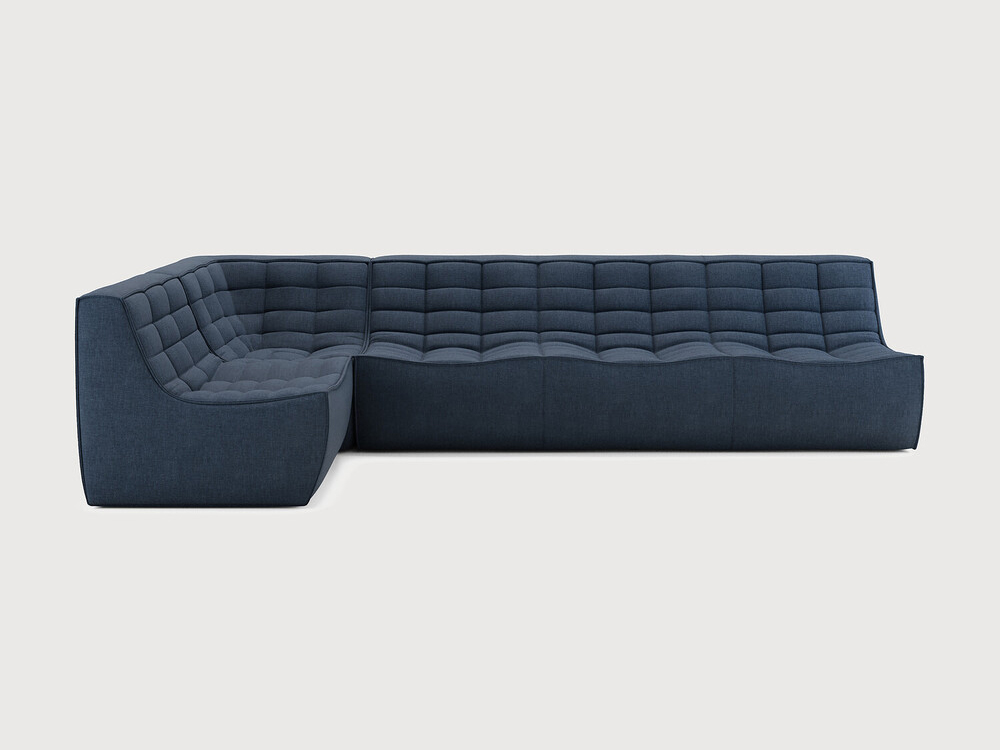 Composition canapé gauche : module 1 place + module d'angle carré à 90° + module 3 places. Des connecteurs inclus pour relier les modules du canapé.