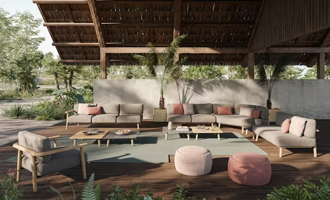 Royal Botania Design. Kris van Puyvelde La collection Mambo Lounge se distingue par ses contours en bois chaleureux élégamment soutenus par un cadre en acier dissimulé, offrant à la fois durabilité et style. Les courbes lisses en bois se fondent harmonieusement avec des coussins moelleux, créant une esthétique accueillante. Optez pour le canapé deux places intime pour des conversations privées ou améliorez votre espace avec des pièces modulaires polyvalentes adaptées aux rassemblements de toute taille. Complétez ces configurations avec une plus grande 220 ou 300 table basse Styletto pour parfaire votre agencement. Que vous recherchiez une escapade privée ou que vous organisiez un événement familial de grande envergure, le lit de jour double Mambo sert de havre de luxe, apportant le confort de votre lit à l'extérieur. salon de jardin extérieur outdoor